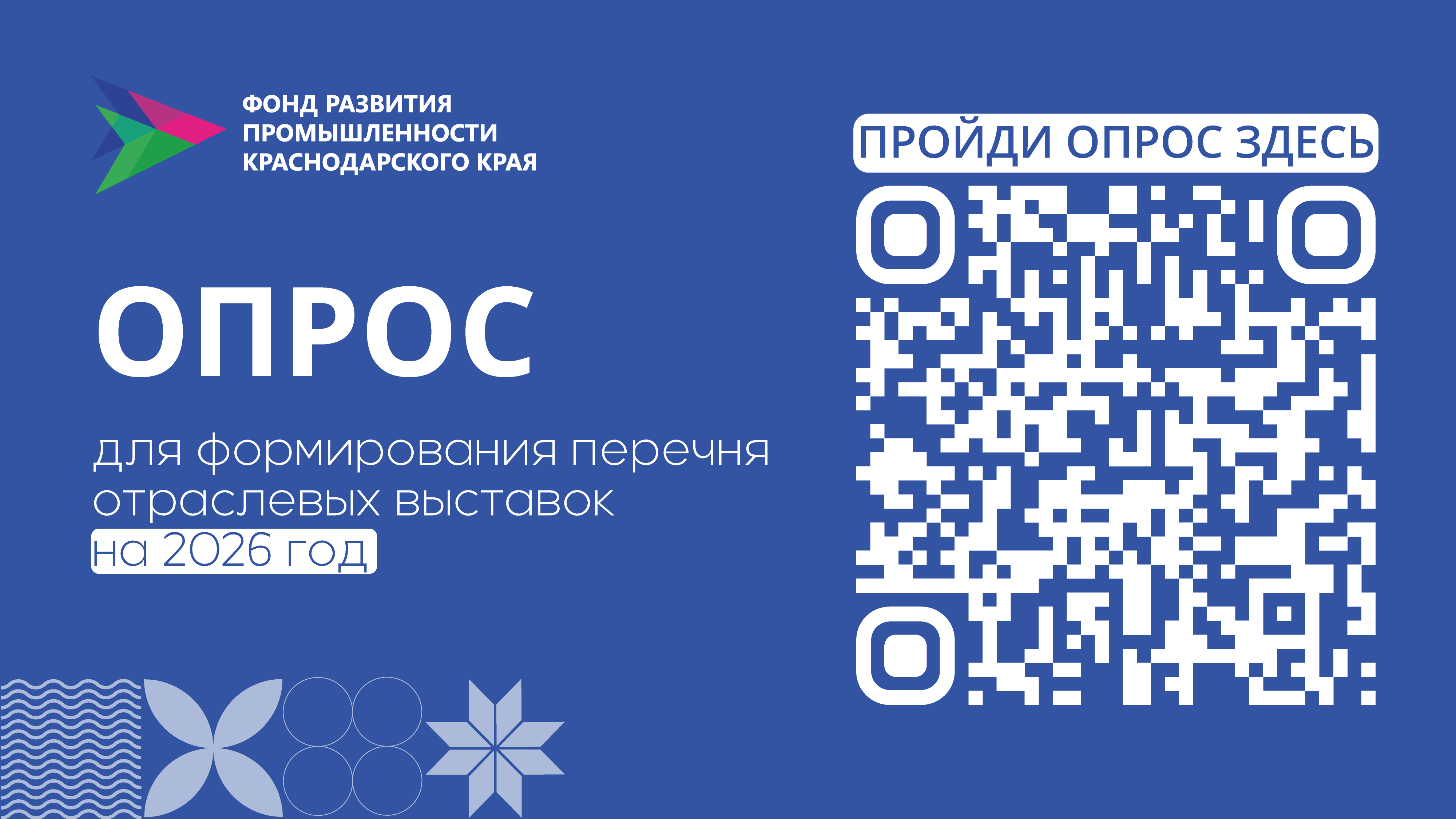 В целях внесения предложений по формированию перечня выставочных мероприятий на 2026 год, планируемых к проведению унитарной некоммерческой организацией «Фонд развития промышленности Краснодарского края» (далее - Фонд) с участием министерства промышленной политики Краснодарского края (далее - Министерство), предлагаем Вам принять участие в опросе производителей промышленной продукции Краснодарского края на официальном сайте Фонда - https://frpkk.ru (баннер опроса на главной странице).