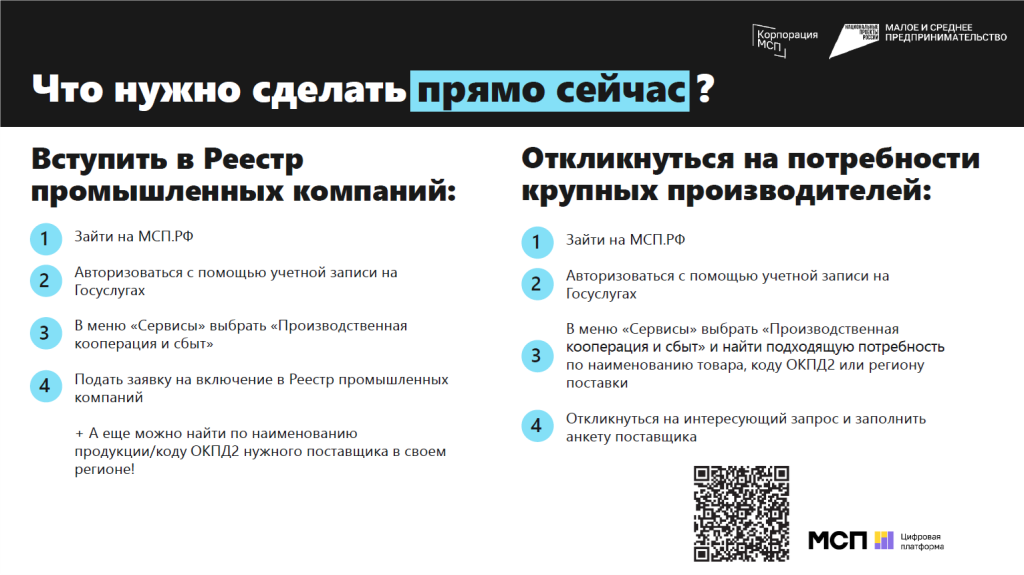 Акционерное общество «Федеральная корпорация по развитию малого и среднего предпринимательства» (Корпорация МСП) в рамках мер государственной поддержки российской промышленности запустила на Цифровой платформе МСП.РФ сервис «Производственная кооперация и сбыт»  https://мсп.рф/services/development/promo/
