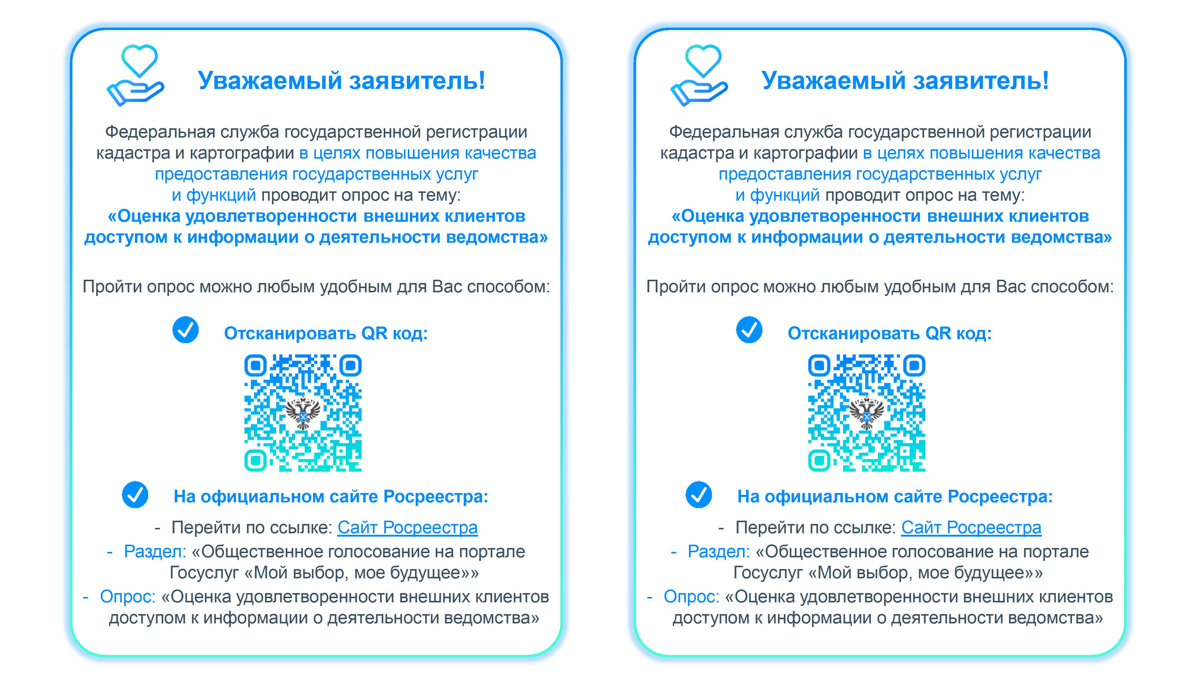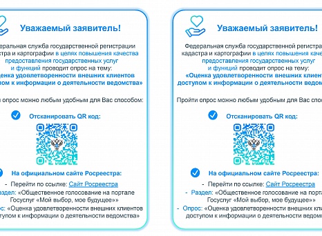 Опрос размещен на главной странице официального сайта Росреестра в информационно-телекоммуникационной сети Интернет в разделе «Общественное голосование на портале Госуслуг «Мой выбор, мое будущее», опрос: «Оценка удовлетворенности внешних клиентов доступом к информации о деятельности ведомства».